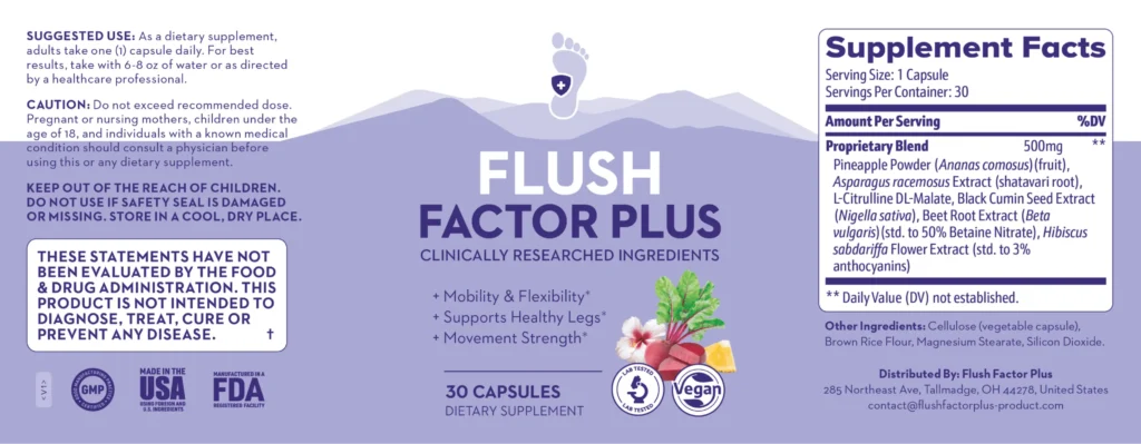 - Enhances joint mobility and flexibility – By improving circulation and reducing inflammation, Flush Factor Plus helps minimize stiffness in the lower body. This allows for smoother, more comfortable movement when walking, climbing stairs, or performing daily activities.